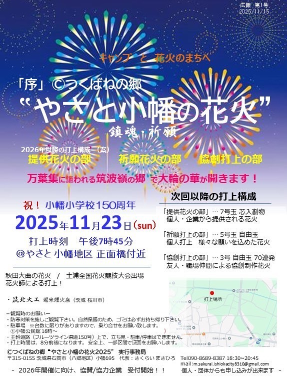石岡市八郷地区にある小幡小学校150周年記念事業として、11月23日 やさと小幡の花火大会が開催されるとのことです‼️